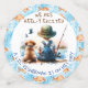 Babydusche Konfetti. Eine hübsche kleine Aquarellillustrierung eines Babyjungen, der mit einem Welpenhund angeln möchte. Die Farben dieser Einladungen sind blau und orange. Niedliche Fische schwimmen im Hintergrund.