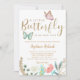 Sweet Baby Dusche Einladung Karte mit rosa und minziger Schmetterling mit Imitaten goldenen Verzierungen. Im Text oben steht: "Ein kleiner Schmetterling ist unterwegs." Ganz unten sind Blume. Passen Sie dieses Produkt an, indem Sie Ihre Party-Informationen hinzufügen.