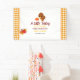 Dieses schöne niedliche Baby-Dusche Banner Design bietet Erntedank Türkei Babydusche "A Little Turkey Is On The Way" Thema mit einem niedlichen kleinen Truthahn, Saisonkürbis und gelb orange weißen Gingham Rand in warmen Herbstfarben. Einfach anpassbarer und bearbeitbarer Text, Schriftart, Farben und feiern Sie Ihr Baby Dusche Party.