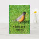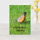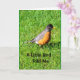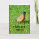 Ein orangefarbenes und schwarzes Rotkehlchen, fotografiert gegen leuchtend grünes Gras, ist das Thema meiner "A Little Bird Told Me It's Your Birthday" Karte.