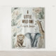Ein minimalistisches Design mit Aquarellsafari-Baby-Tieren und gedämpftem Dschungelblättern, mit elegantem Text für eine geschlechtsneutrale Babydusche oder zum ersten Geburtstag.