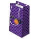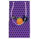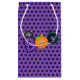 Eine Niedliche kleine Geschenktasche zu Halloween in Lila und schwarzen Sternen und dem Wort Boom