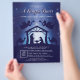Feiern Sie die wahre Bedeutung von Weihnachten mit dieser eleganten Kirchenflyervorlage "Ein König ist geboren". Mit einer wunderschönen Weihnachtsszene unter einem sternenklaren Nachthimmel erfasst dieses Design perfekt den Frieden und die Freude von Christi Geburt. Dieser Flyer ist ideal, um den Weihnachtsgottesdienst Ihrer Kirche zu bewerben und bietet Platz für Details wie Zeit, Datum und Ort. Die zeitlosen Blautöne und die elegante Typografie schaffen ein warmes, einladendes Design, das perfekt zum Drucken geeignet ist. Professionell gestaltet und leicht anpassbar, ist es eine wunderbare Möglichkeit, Ihre Gemeinde und die Öffentlichkeit zu einem Abend des Gottesdienstes, der Hymnen und der Schrift einzuladen. Personalisieren Sie es einfach mit den Informationen Ihrer Kirche und teilen Sie die Freude von Weihnachten.