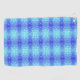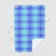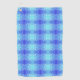 Ein lebendiges Handtuch mit einem symmetrischen Muster in Blau- und Türkistönen, das einem Kaleidoskop ähnelt. Das Design ist gefüllt mit kleinen weißen Punkten, die ein energiegeladenes und erfrischendes Gefühl erzeugen. Ein kleines rundes Etikett ist an der oberen linken Ecke angebracht.