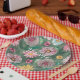 Ein lebendiges blumengeschmücktes Set vor grünem Hintergrund. Die Blume sind in Rosa, Gelb und Weiß gehalten, mit feinen Details wie den Blätterkanten und den Blume. Die Blume werden durch grüne Blätter ergänzt. Das Gesamtbild verleiht dem Ganzen ein frisches und lebendiges Ambiente, das an den Frühling oder den Sommer erinnert.