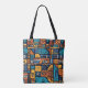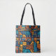 Ein lebendiges und abstraktes geometrisches Muster, bestehend aus verschiedenen Formen, Linien und Symbolen in Blau-, Orange- und Schwarzwönen. Das Design hat eine Stammes- oder ethnische Ästhetik, mit sich wiederholenden Motiven und ein Gefühl von Rhythmus und Bewegung über die Komposition tote Tasche