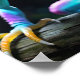 Ein lebhaftes Reptil mit einer Mischung aus lebhaften Farben wie Grün, Blau, Gelb und Rosa ist auf einem Holzstück stehend, das vor einem dunklen, verschwommenen Hintergrund steht. Die Detailskala und die auffälligen Augen verstärken das faszinierende Aussehen der Kreatur.