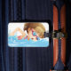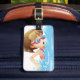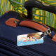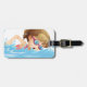Ein Mädchen, das eine rosa Gepäckanhänger