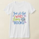 Dieses Design verfügt über einen weißen T - Shirt mit dem Text "Just A Girl WHO Lieben BOOKS" in einem stilisierten Schriftart mit mehreren Farben. Das Design enthält eine Grafik eines offenen Buches.