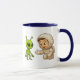 Ein dekorierter Mug mit dem Bild eines kleinen kosmonautischen Jungen, der auf dem Mars landet, trifft einen Marsmenschen, die Situation ist warm, das Kind streckt seine Hand als Zeichen der Freundschaft aus.