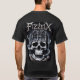 Ein monumentaler Schädel, der einer gotischen Kathedrale ähnelt, mit aufwändigen Rose und Bögen, die in die Schädelstruktur eingebaut sind. Der Nebel zieht sich aus den Augensockeln heraus. Oberhalb des Schädels wird das Wort "FizzelX" mit einem gotischen, gebrochenen Schriftart in uraltes, verwittertes Metall eingeprägt. Dunkel und majestätisch, was ein finsteres und kraftvolles Ambiente für ein Metall-T - Shirt-Design.