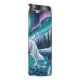Diese schöne Abbildung zeigt einen weißen, mystischen Wolf, der durch einen gefrorenen See geht, der von Eiskristallen bedeckt ist. Die Szene ist Set unter einem majestätischen Nachthimmel voller Polarlichter, zwei Monde und Vollmond. Die Kunst ist sehr stark, spirituell und fantastisch, perfekt