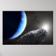 Das Konzept eines Künstlers von Neptun's winzigen Mond Hippocamp wurde 2013 vom Hubble-Weltraumteleskop entdeckt. Nur 35 km breit, könnte es sich tatsächlich um ein abgeschnittenes Fragment aus einem viel größeren benachbarten Mond, Proteus, handeln, das als Halbmond im Hintergrund angesehen wird. Dies ist der erste Beweis dafür, dass ein Mond ein Ableger eines Kometen-Aufpralls mit einem viel größeren Mutterkörper ist.