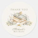 Geschlechtsneutraler Baby-Shower-Danke-Aufkleber mit Vintage-Büchern und wasserfarbenem botanischem Design fügt Ihrer Feier eine zeitlose und elegante Note hinzu. Die Darstellung von sanften, gedämpften Salbei-„Danke“-Buchstaben, gepaart mit einem charmanten Stapel klassischer Bilderbücher, der mit einem süßen Baby-Accessoire gekrönt ist, fängt das raffinierte literarische Thema ein, das perfekt für eine neutrale Baby-Shower ist. Die sanfte, erdige Typografie harmoniert wunderbar mit zarter Vegetation und luftigen Wasserfarben-Blumen und schafft eine waldinspirierte Ästhetik, die warm, raffiniert und perfekt aufeinander abgestimmt wirkt. Der sanfte, neutrale Hintergrund unterstreicht die Salbei-Akzente und botanischen Details und ermöglicht es dem Design, rustikale, garten-, vintage- oder klassische Baby-Shower-Dekorationen zu ergänzen. Ideal zum Verschließen von Geschenktüten, Dekorieren von Süßigkeiten-Boxen, Verzieren von Dankeschön-Geschenken oder Hinzufügen eines polierten Details zu Partygeschenken. Dieser neutrale Baby-Shower-Danke-Aufkleber verbindet Einladungen, Teller, Servietten und Willkommensschilder mit einem einheitlichen Stil. Die elegante Serif- und Skript-Typografie kombiniert mit subtilen Blumen-Akzente schaffen eine