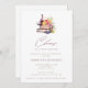 Ein neues Kapitel Wein & Bücher Brautdusche Einladung mit einer Aquarellzusammensetzung einer Weinflasche, Glas, Bücher und Blume. "Cheers" ist in Masala moderne Handschrift.