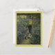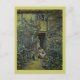 Kleines Mädchen vor der Rose überdeckte Hütte hält eine Schüssel Milch für ihre graue gestreifte Katze aus. Kunstkunst mit Blume von Helen Allingham (19. Jahrhundert).
