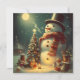 Dieses Bild zeigt einen lächelnden Schneemann, der einen schwarzen Oberkörper und einen roten und weißen Schal trägt. Er ist von Geschenken und einem beleuchteten Weihnachtsbaum umgeben. Hinter ihm sehen wir ein Haus und schneebedeckte Bäume. Der Himmel ist dunkel und sternförmig, mit einem hellen Vollmond. Dieses Wunschbild erinnert an Magie und Weihnachtsfreude.