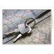Asset-ID: 9585557 / Christine Balderas / Ein Set von Autoschlüsseln auf einem Stapel von Straßenkarten.