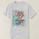 Party an mit einem Japanisch-inspirierten Tribut zur feinsten Komödie des Barden! Sein Aroma von Japan-themenorientierter Produktion NCSS nehmend, kennzeichnet das Shirt das Wort "Traum" in einem großen zentralen Charakter, der umgeben wird durch andere japanische Charaktere für die Themen des Spiels, wie "Freundschaft" und "Liebe" und "Umwandlung."