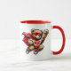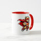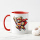 Ein Superheld fliegt mit einer dynamischen Pose, der Faust hoch und dem roten Umhang hinter ihm. Er trägt eine rote Maske und einen weißen und roten Anzug mit einem Superheldensymbol auf der Brust. Mit seinen scharfen Turnschuhen und seinem entschlossenen Blick sieht er mutig und energisch aus. Ihr von Comics inspirierter Stil gefällt Kindern und Amateuren von süßen und heldenhaften Charakteren.