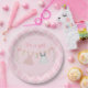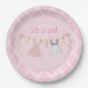 Ein süßes Mädchen ist unterwegs. Babydusche. Teller aus hübschem Party.