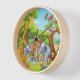 Hier ist ein Bild einer lebendigen und skurrilen Darstellung verschiedener Zootiere, die sich in einem sonnigen Lebensraum versammelt haben. Die Szene umfasst eine große Giraffe, die sich den Hals ausdehnt, um Blätter von einem Baum zu essen, einen verspielten Elefanten, der Wasser spinnt, einen farbenfrohen Papagei, der auf einem Ast steht, und eine Gruppe seltsamer Affen, die von den Ästen der Bäume schwingen. Im Hintergrund gibt es eine üppige Vegetation, einen klaren, blauen Himmel und einige Besucher, die die Tiere aus der Ferne bewundern. Der Stil ist kartoonisch und fröhlich und richtet sich an Kinder: