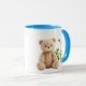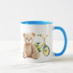 Ein Teddybär vor einem Kinderrad. Tasse