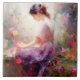 Ein von der KI generiertes Bild eines Mädchens, das in einem Blumengarten träumt. Ideal für ein Kinderzimmer oder ein Mädchenzimmer.