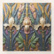 Iris-Blume mit goldenen, rosa, grünen und lila Farben, symmetrischer Komposition, verzierten Details, dunkelgrauem Hintergrund, Jugendstil, dekoratives, aufwändiges Design.