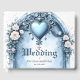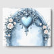 Ein verzierter, hellblauer Bogengang mit Blumenakzenten, Herzemblem und Rose. Entdecken Sie einen eleganten Bogengang mit zwei Säulen mit einem Gewölbe, reich verziert mit aufwändigen Schnitzereien und einem zentralen, herzförmigen Emblem. Weiße Rosen mit Pfirsichfarben, zarte Blätter und kleine weiße Blüten bilden den Rahmen für das entworfene Tor. Ideal für Firmen- oder Produktpräsentationen, Hochzeiten oder Eventdesigns, die klassische Romantik mit modernen Farbschemata verbinden.