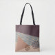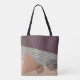 Diese Tasche hat ein modernes abstraktes Design aus blauer Linie, einem bräunlichen Dreieck und einem braunen Kreis aus Punkten auf einem Feld aus dunkler Aubergine und Sahne. Wenn Sie das gleiche Design mit verschiedenen Farben gewollt haben, schreiben Sie mir.