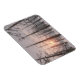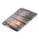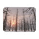 Eine blasse Wintersonne Set hinter mächtigen Lärchenbäumen wie dunkle Sentinels. Ihre versteinerten Zweige, nackt, außer einer Beschneiung von Schnee, und die pastellfarbenen Golden, Pinks und Blues des Sonnenuntergangshimmels werden als durch einen traumhaften Dunst angesehen. Im Vordergrund fallen sanft Schneeflocken.