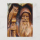 Ein weiser alter Zauberer, Hexe oder Hexe mit einem schweren Bart und fließenden Roben steht in einem Höhleneingang mit seinem Zepter oder Heftklammer und einer Eule auf seiner Schulter. Farbiges Foto von fein detaillierten Kunstwerken aus Holz.