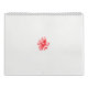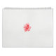 Das Design zeigt eine grafische Darstellung einer Blume mit zahlreichen Blättern. Die Blätter werden mit roten, schreiber-ähnlichen Strichen dargestellt, die den Eindruck einer Skizze oder eines abstrakten Gemäldes vermitteln. In der Mitte befindet sich ein kreisförmiges Muster in Rosa und lila Farbtönen, das den Kern der Blume nahe legt. Der Hintergrund ist schlicht weiß und steht im Kontrast zum lebhaften Rot der Blätter.