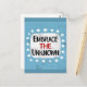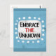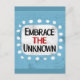 "Embrace The Unknown" ist ein niedliches inspirierendes oder motivierend Zitat mit einer weißen Akzent-Form, umgeben von weißen, texturierten, whimsikalen Punkten.
