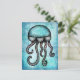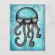 Eine modische Qualle mit einer knorpelartigen gezeichnet Qualle auf blauem und aquarelem Hintergrund mit Buchseite und roten Akzenten.