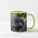 Eine schimpansische Mutter wacht über ihr Affenbaby und blotgt gegen sie, mitten in einem grünen Regenwald. Ihr schützender Blick drückt die Zärtlichkeit und die mütterliche Liebe aus, die sie ihrem Kind anbringt. Das Schimpansenbaby, das an seine Mutter gefesselt ist, beobachtet die Welt mit merkwürdigen Augen, bereit, seine Umgebung zu entdecken. Die natürliche Szene ist friedlich, mit dem Tageslicht, das durch die blättrigen Äste filzt und das glänzende schwarze Fell beider Tiere beleuchtet. Dieser wartende Moment spiegelt Komplizenschaft und Schutzinstinkte in dieser wilden Familie wider.
