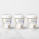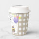 ALBERN GOOSE. Party mit Aquarellfarben-Kindergeburtstag. Wasserfarbene niedliche Gans in Geburtstagshut, Kuchen mit Beeren, lila Ballon, festliche Garland von Fahnen. Beigefarbener Käfighintergrund.