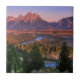 Dieses Foto kennzeichnet die Ansicht der majestätischen großartigen Teton Gebirgsstrecke vom Snake River übersehen in Jackson Hole, Wyoming.