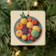 Auf einem Teller wird eine lebendige Anordnung verschiedener Früchte mit Orangen, Wassermelone, Trauben und Erdbeeren präsentiert. Geometrische Formen und fette Farben verleihen der Komposition ein modernes und spielerisches Aussehen.
