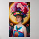 Ein Bild einer Dame mit einem blumigen Sonnenhut. Dieses Bild wurde von AI mit Blumendesign erstellt.