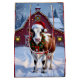 Weihnachtsgeschenktüte im Landhausstil mit einer Darstellung einer festlichen Kuh in einer Weihnachtsmannmütze, stehend vor einer prächtigen roten Scheune, die in Weihnachtsbeleuchtung dekoriert ist, und einem festlichen Kranz an einem schneebedeckten Wintertag. Die Rückseite ist ein Hintergrund oder rustikalen Stallholz.