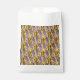 Eine flauschig graue Katze mit grünen Augen sitzt Geschenktütchen