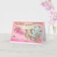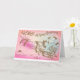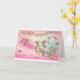Weihnachtskarte in Rosa, Gold und Weiß mit dem Weihnachtsmann auf seinem Schlitten mit Rentieren und im Hintergrund Häuser. Vintage Ästhetik. Retro