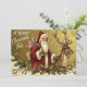 Diese Weihnachtskarte im Vintage-Stil zeigt eine klassische Illustration von Santa Claus, der in einer traditionellen, langen roten Robe mit weißem Pelzbesatz gekleidet ist und einen Sack voller Puppen und Spielzeuge über der Schulter trägt. Er steht neben einem großen Rentier und hält dessen Lederzaum vor einem texturierten, goldfarbenen Hintergrund. Die Szene wird am unteren Rand von festlichen Zweigen mit Stechpalmen mit roten Beeren und Mistelzweigen mit weißen Beeren gerahmt, während die Grußformel "A Happy Christmas Tide" in eleganter weißer Schrift oben links erscheint.