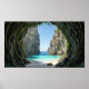 Dieses Bild zeigt eine geheime Bucht, die nur durch eine schmale, von Weinreben überwucherte Meeresgrotte zugänglich ist. Das Wasser darin ist ein unglaublich helles Türkis. Zerklüftete Klippen umrahmen den unberührten Strand in einer hochdetaillierten digitalen Matte-Malerei mit Art Nouveau-Einflüssen.