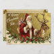 Diese Weihnachtskarte im Vintage-Stil zeigt eine klassische Illustration von Santa Claus, der in einer traditionellen langen roten Robe mit weißem Pelzbesatz gekleidet ist und einen Sack voller Puppen und Spielzeuge über der Schulter trägt. Er steht neben einem großen Rentier und hält dessen Lederzaum vor einem texturierten, goldfarbenen Hintergrund. Die Szene wird am unteren Rand von festlichen Zweigen mit Stechpalmen mit roten Beeren und Mistelzweigen mit weißen Beeren gerahmt, während die Grußformel "A Happy Christmas Tide" in eleganter weißer Schrift oben links erscheint.