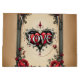 Eine gotische Romantik. Ein verzierter, gotischer Rahmen mit beigem Hintergrund. Rote Rosen mit dunkelgrünen Blätter sind um den Rahmen herum angeordnet, insbesondere in den Ecken. In der unteren Mitte befindet sich ein dekoratives, herzförmiges Emblem mit dem Wort "LIEBE" in einem stilisierten Schriftart.