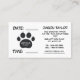 Diese Appointment Card hat einen großen schwarz-weißen Hundepaw-Druck mit Ihrem Firmennamen, der rund um den Pfotendruck gebogen ist. Auf der Vorderseite der Karte steht der Termin und Ihre Telefonnummer, Ihr Titel oder Ihre Tagline werden in weißer Schrift auf dem schwarzen Pfotendruck für ein skurriles Design hinzugefügt. Die Rückseite der Karte hat ein geteiltes Design, mit einem großen schwarz-weißen Hundepflaster. Auf der links Seite erscheint ein personalisierter Zeitplanhinweis in weißer Schrift über dem schwarzen Pfotendruck. Auch auf der verlassen Seite stehen Datum und Uhrzeit in großen Buchstaben zur Verfügung, damit Sie schnell und einfach ausfüllen können. Auf der rechten Seite zeigen Sie Ihren Namen, Titel und/oder Service, Geschäftsadresse, Telefon und oder Handy, E-Mail und Website. Dieser große Pfotendruck ist auch in einer Sammlung enthalten.