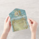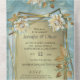 Eine hellblaue Palette liegt vor einem Kupfer/Bronze-Hintergrund im Barogue-Stil. Die Karten sind mit cremefarbenen Blume und vergoldeten Blätter über einem vergoldeten Rahmen für Ihre ganz besondere Note in einer einzigen Einladung dekoriert.